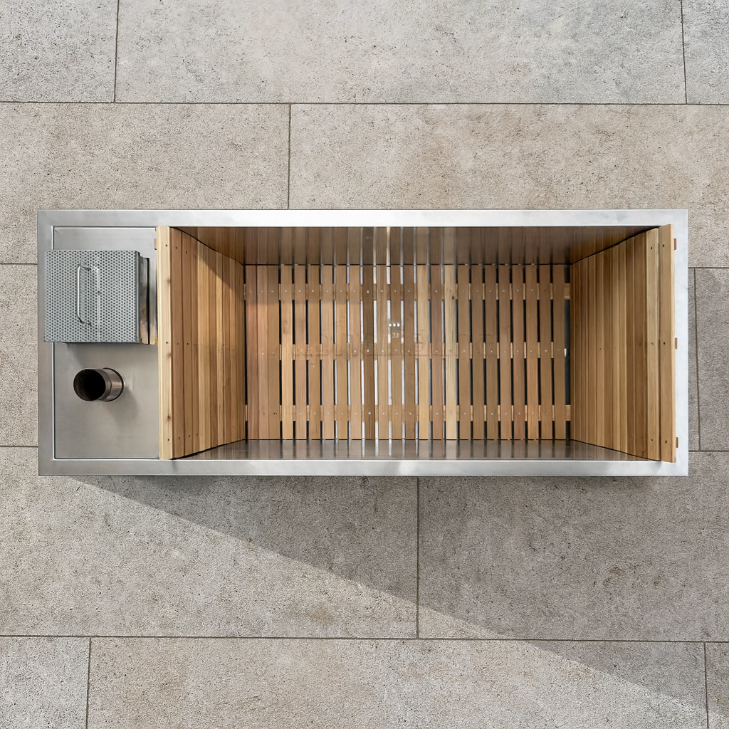 At its heart lies a powerful internal wood-fired stove, protected by a refined stainless-steel enclosure. This heating method delivers deep, authentic warmth you can feel down to the core — a richer, more immersive thermal experience than standard electric systems. A tall, polished stainless-steel chimney flue enhances airflow for fast heating, while adding an unmistakable sculptural statement to the tub’s silhouette.
